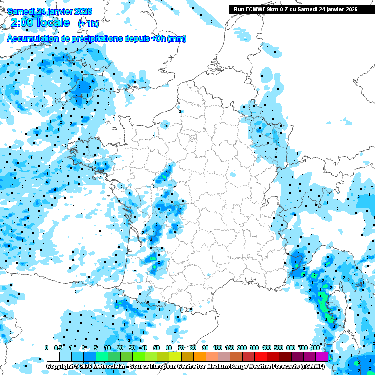 Cumuls de pluie prévus d'ici le 8 février (modèle météo européen)