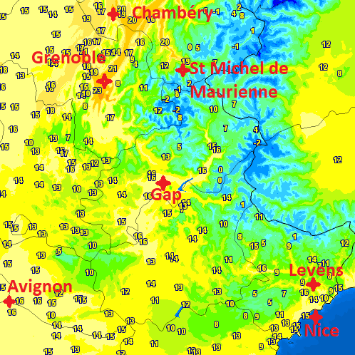 Le vigoureux flux de Sud n'est pas le seul à apporter de la douceur. Car bien que ce flux draine des masses d'air d'origine subtropicales sur notre pays, leur adiabatique ne suffit pas à expliquer le fait qu'il ait été relevé près de +23°C dans le Sillon Alpin, près de Grenoble, aujourd'hui. Encore moins qu'il ait fait simultanément +19°C à Saint-Michel de Maurienne (698m) en Savoie contre +9°C au même moment à Levens (691m) dans les Alpes-Maritimes... 10°C de différence à la même altitude donc!
