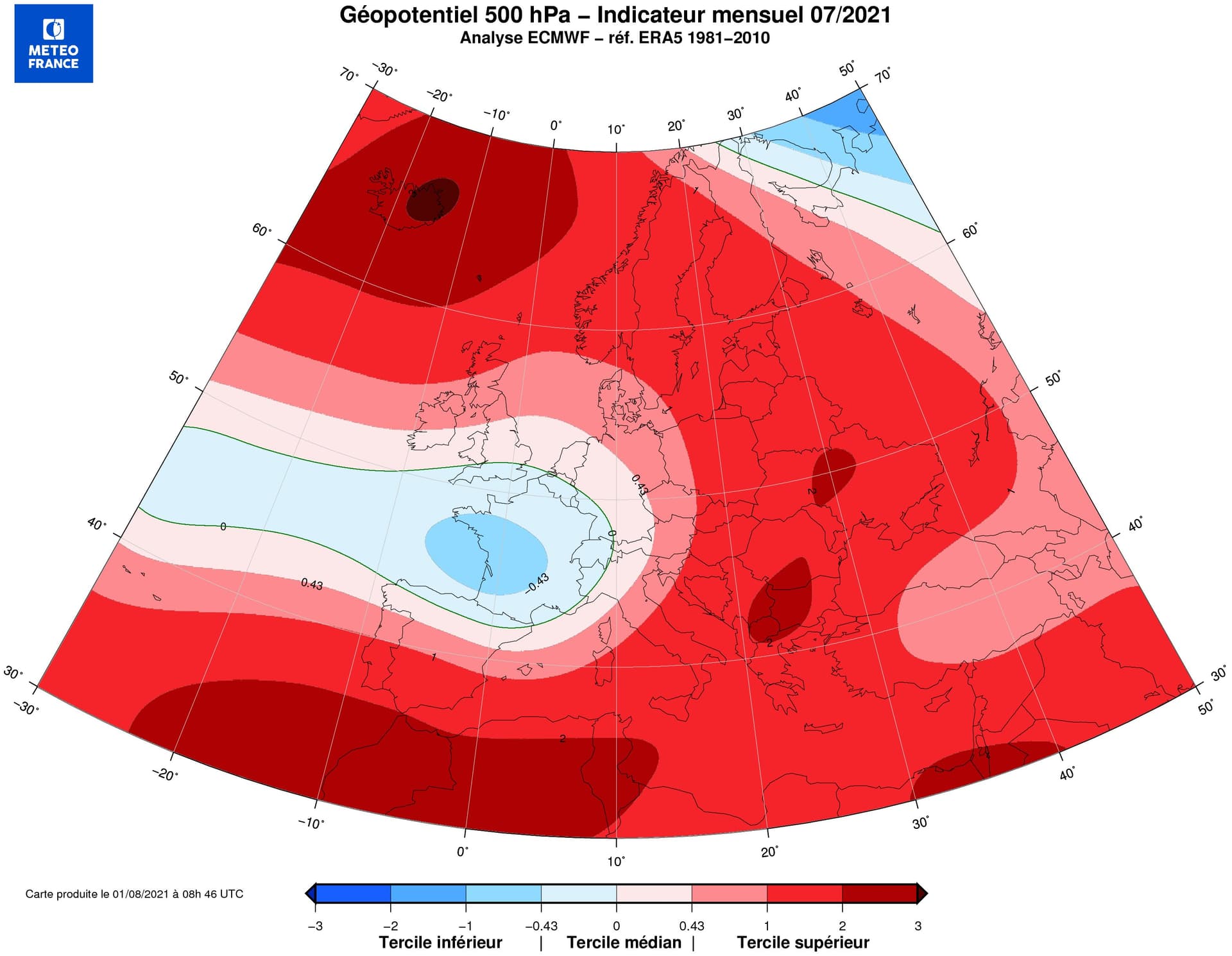 Anomalie des géopotentiels à 500hPa (5500m d'altitude) en Europe - juillet 2021 - Météo-France