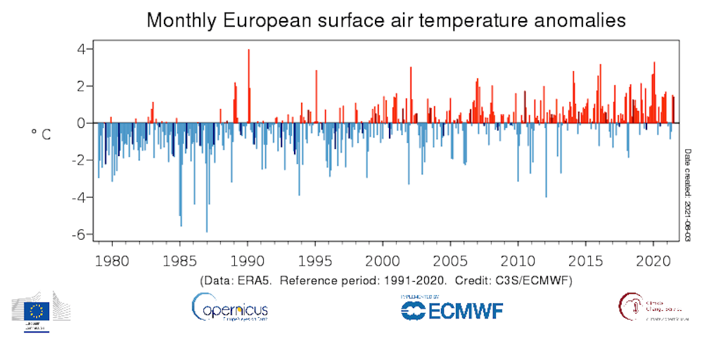 La température moyenne européenne pour juillet 2021 était de 1.41°C supérieure à la moyenne 1991-2020 selon le programme européen de surveillance de la Terre "Copernicus", soit le 2e mois le plus chaud observé en Europe depuis le début des analyses en 1979. Le seul mois de juillet enregistré qui a été plus chaud en Europe a eu lieu en 2010, lorsque l'ouest de la Russie a connu une forte canicule et que la température moyenne européenne a été de 1.72 °C supérieure à son niveau de 1991-2020.