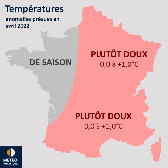 Ainsi, le mois d'avril 2022 pourrait être plus humide que le début du printemps sur les régions du nord de la France, davantage influencées par le flux océanique. Les régions du centre pourraient connaître une pluviométrie assez classique tandis que le temps serait plus sec que la normale dans le sud, particulièrement vers PACA où les signaux de poursuite de l'anomalie sèche sont les plus forts.