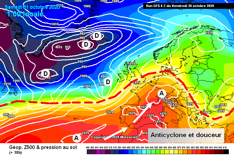 Schéma de la situation atmosphérique sur l'Ouest de l'Europe le Samedi 31 Octobre - Modèle GFS via météociel.fr