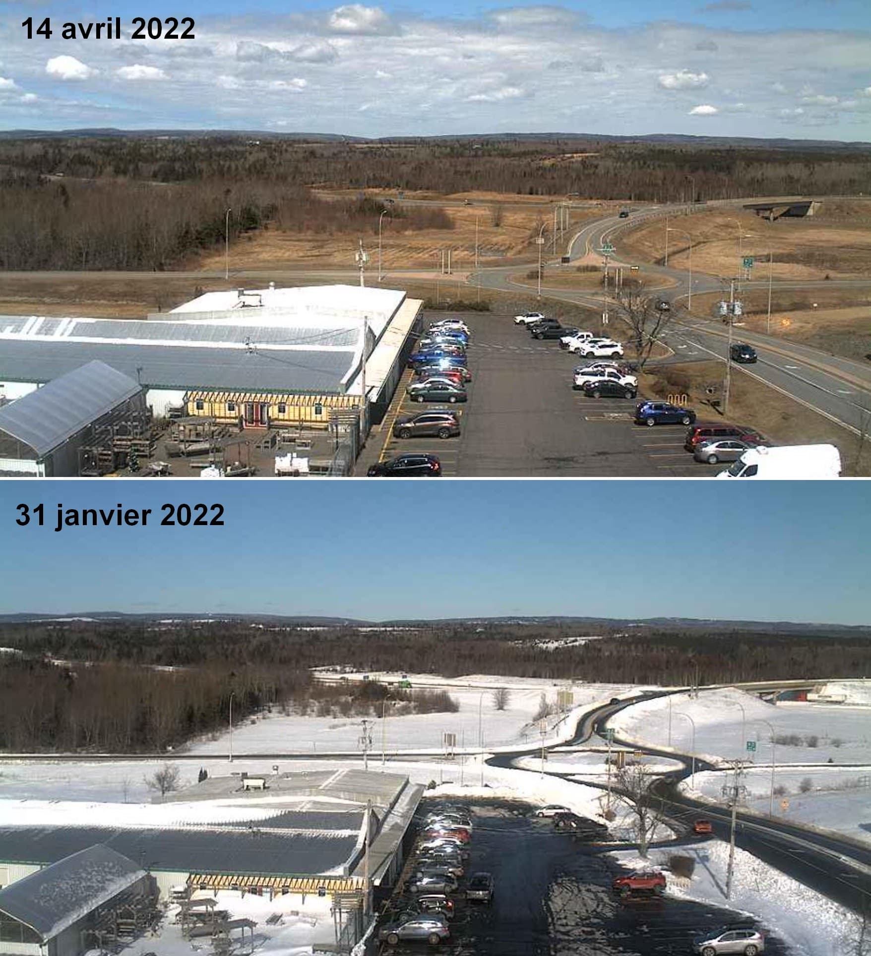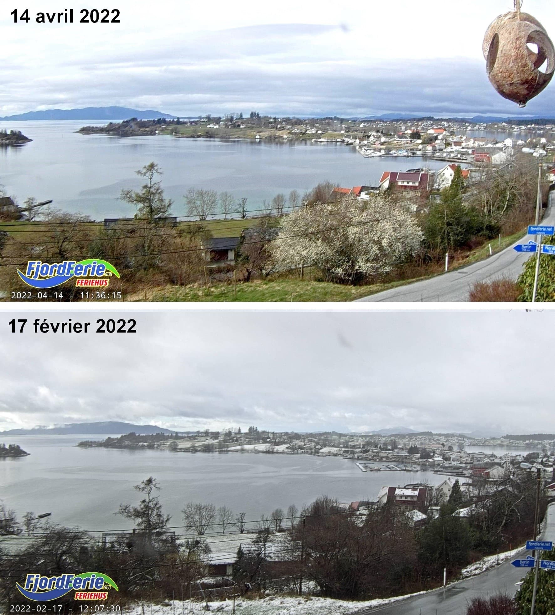 Comparaison entre le 17 février et le 14 avril 2022 sur la webcam de Saebovik : Halsnøy dans le Sud de la Norvège– Via Windy.com