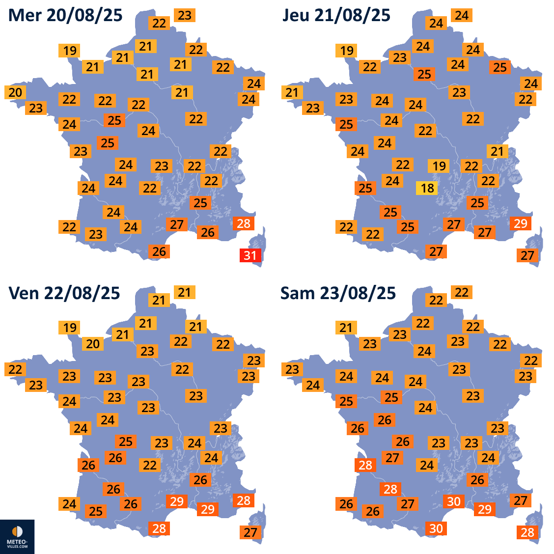Températures maximales prévues du mercredi 20 au samedi 23 août 2025 - Météo Villes
