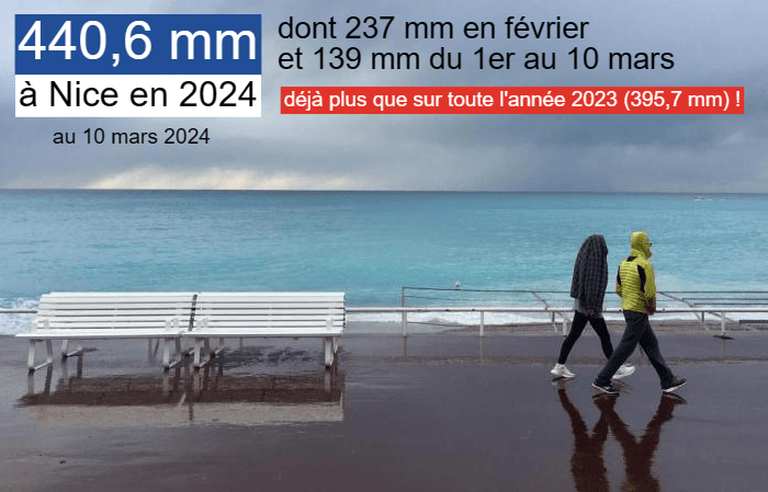 Certaines stations du sud-est connaissent un début d'année 2024 particulièrement arrosé, qui contraste avec l'année 2023 excessivement sèche. C'est par exemple le cas sur la côte d'Azur, qui enchaîne les épisodes pluvieux d'ampleur depuis quelques semaines. Ainsi, la station de Nice totalise déjà plus de 440 mm de pluie entre le 1er janvier et le 10 mars 2024. C'est déjà plus que le cumul de l'ensemble de l'année 2023 (395,7 mm) ! En d'autres termes, il a davantage plu à Nice en deux mois et 10 jours que lors des 12 mois précédents !