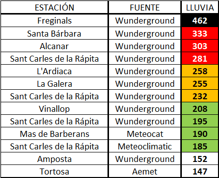 Un exemple concret de cet aspect très localisé et peu mobiles des orages s'est produit ce dimanche dans la province de Tarragone. Dans le courant de l'après-midi, un virulent orage stationnaire s'est en effet développé non loin du delta de l'Ebre, apportant des quantités astronomiques de précipitations sur ce secteur, notamment entre Montsia Mar, La Rapita et Santa Barbara.