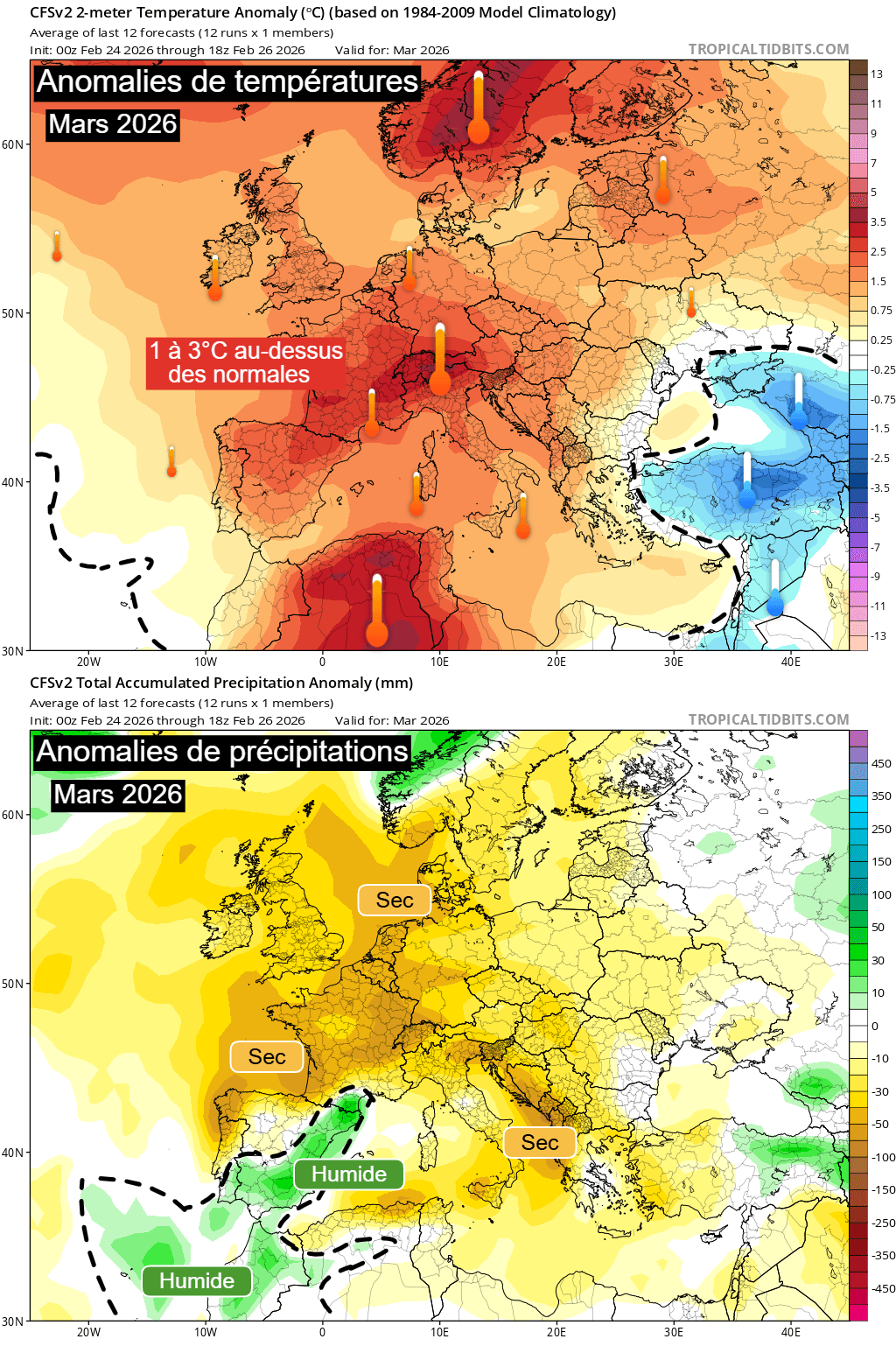Anomalies de températures et de précipitations sur la France pour le mois de mars 2026 – via TropicalTidBits