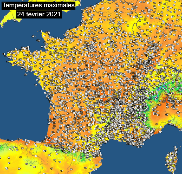 Températures maximales relevées sur la France le 24 février 2021 – Via Infoclimat
