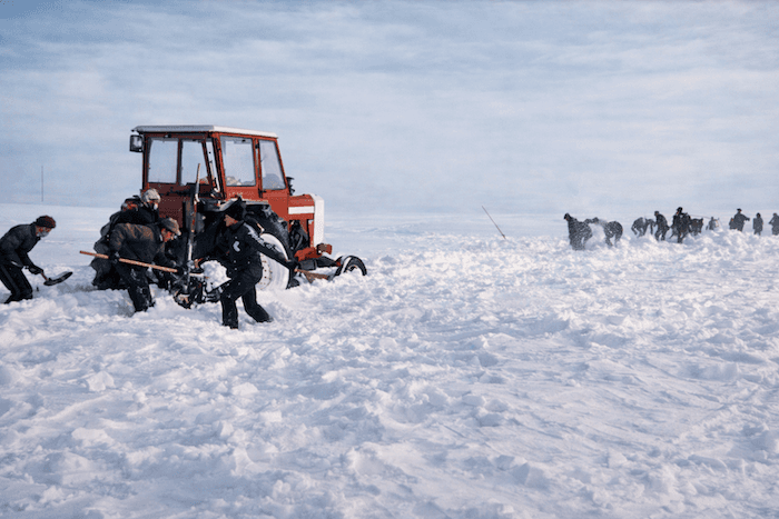 5 janvier 1979 : La population est les militaires tente de dégager un tracteur dans les plaines de la Beauce en plein blizzard - photo colorisée - Le Pli d'Etampes