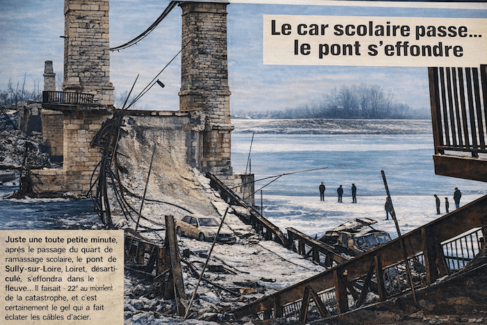 L'effondrement du pont de Sully-sur-Loire (Loiret) en raison du froid extrême (-22°C) ayant fait éclater les câble d'acier. Photo d'archives meteo-paris.com