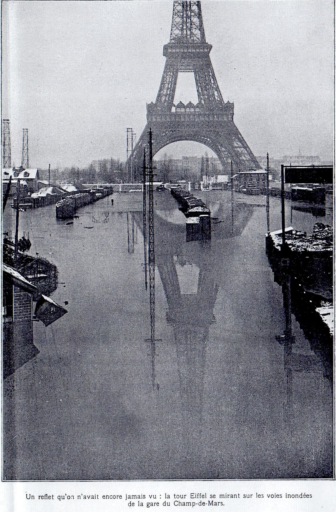 Un reflet qu'on n'avait encore jamais vu : la Tour Eiffel se mirant sur les voies inondées de la gare du Champ-de-Mars. Janvier 1910.