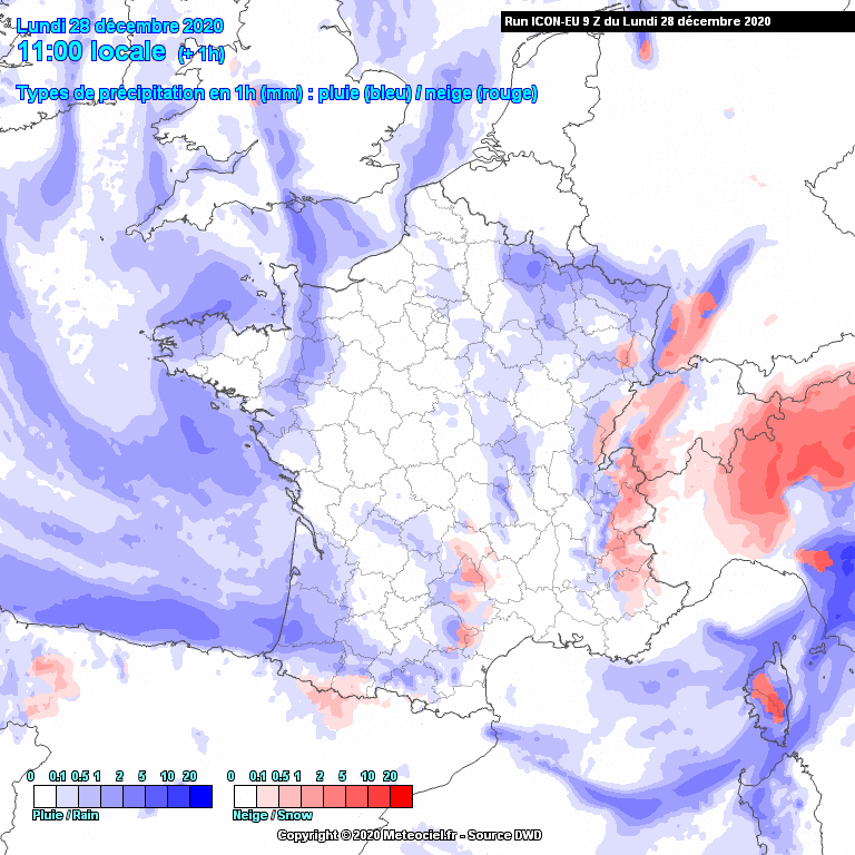 Ce front se décale peu à peu vers l’Est d’ici la nuit prochaine en donnant parfois pluies et neige mêlées jusqu’en plaine des côtes de la Manche à l'Allemagne. De la neige seule pourra être observée sur les plateaux près de la région parisienne et du Nord-Est du pays.