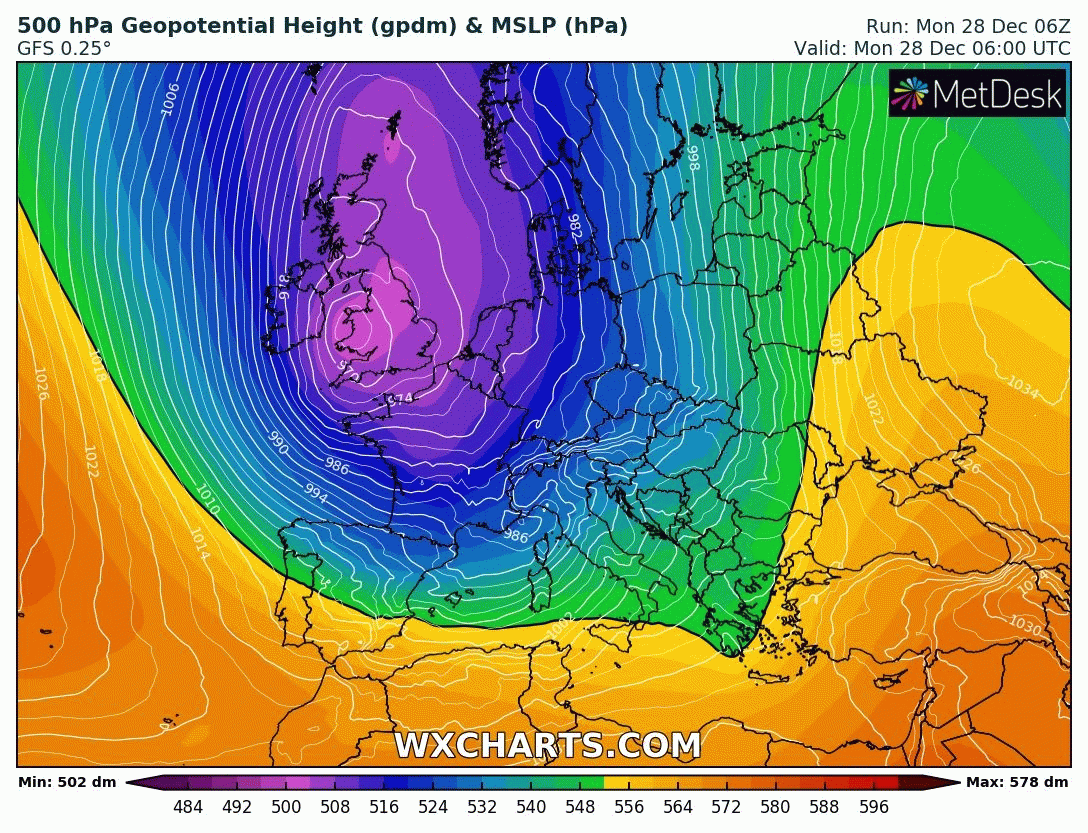 Animation des géopotentiels sur l'Ouest de l'Europe du Lundi 28 au mardi 29 décembre – Modèle GFS via WX CHARTS