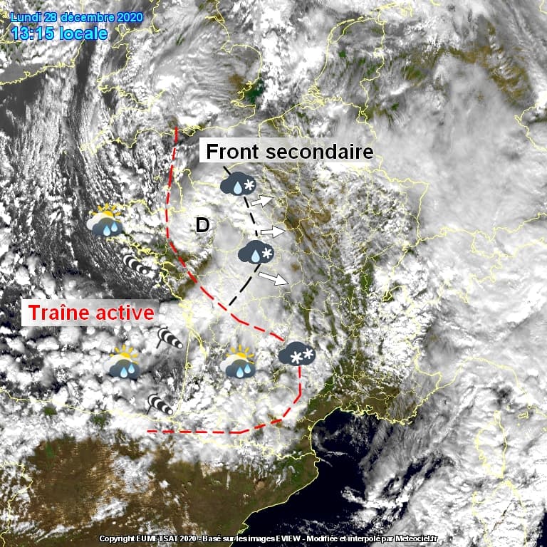 Analyse de la situation atmosphérique de ce lundi 28 décembre à 13h15 - EUMETSAT via météociel.fr