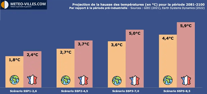 Les modèles climatiques sont unanimes sur une poursuite de cette hausse rapide d'ici à la fin du siècle. Ils confirment aussi que ce réchauffement sera plus important sur notre pays qu'en moyenne sur Terre, et ce quel que soit le scénario. En effet, que l'on retienne le scénario le plus optimiste (SSP1-2,6), intermédiaire (SSP2-4,5), pessimiste (SSP3-7,0) ou même extrême (SSP5-8,5), la température en France augmentera de manière plus significative que la moyenne mondiale d'ici 2100. Dans le scénario le plus extrême, cette hausse pourrait atteindre +5,9°C en France sur la période 2081-2100 contre +4.4°C au niveau mondial. Notre pays sera donc aux premières loges du réchauffement climatique.