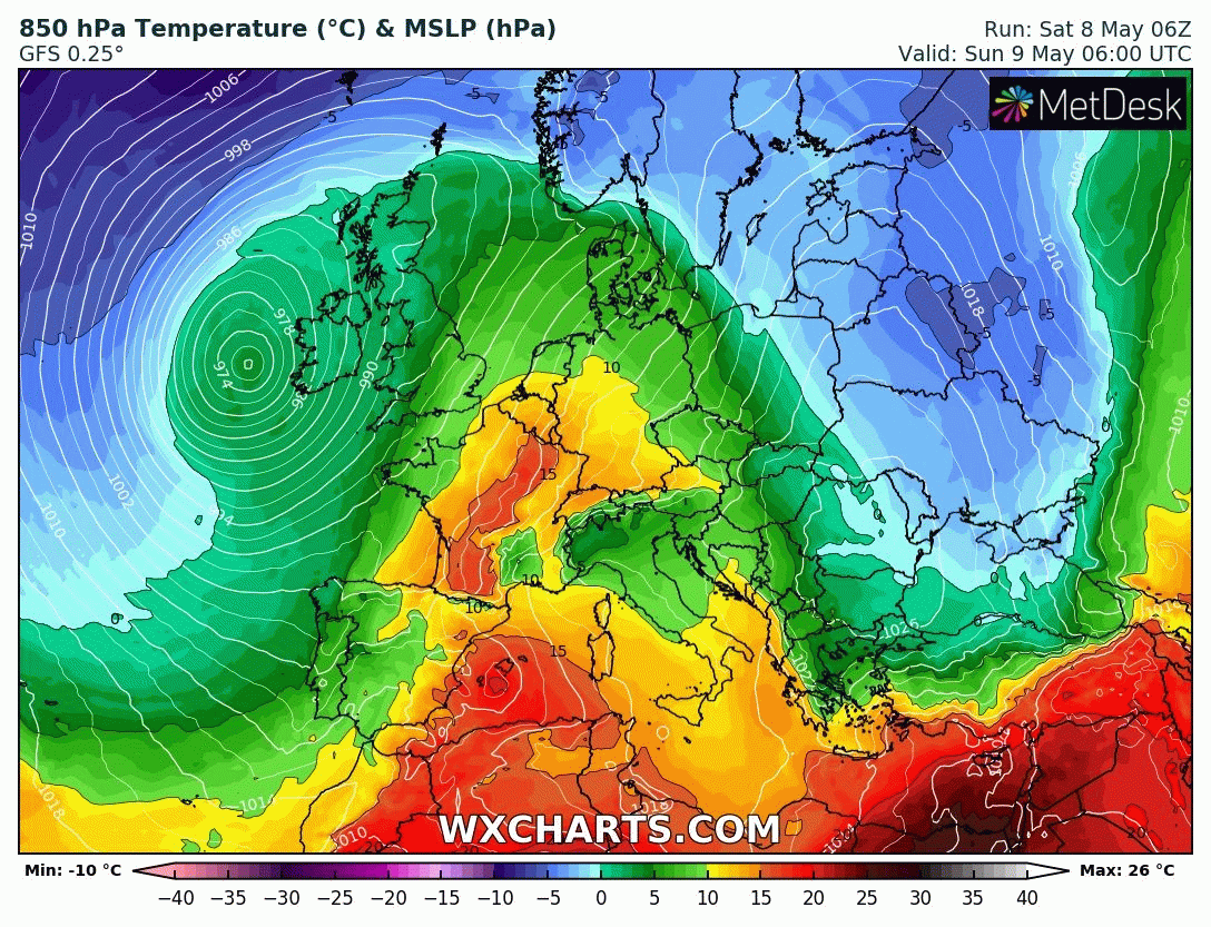Animation des températures à 850hPa sur l’Ouest de l’Europe du dimanche 9 au samedi 15 mai 2021 – Modèle GFS via WX CHARTS
