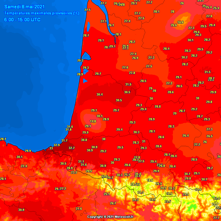 Températures maximales relevées ce samedi 08 mai 2021 sur l’Aquitaine – via meteociel