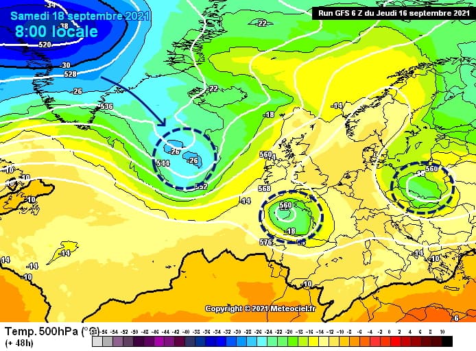 Exemple d'une situation avec 3 gouttes froides sur l'Europe le 18 septembre 2021 - via meteociel.fr