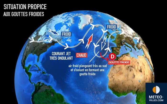 Qui dit courant jet sinueux dit également davantage de gouttes froides. En effet, lorsqu'une coulée d'air polaire plonge à des latitudes méridionales, il n'est pas rare que cet air froid se retrouve piégé au sein des masses d'air chaud. C'est ainsi qu'une petite dépression associée à une anomalie d'air froid se forme : la goutte froide. Souvent entourées par des hautes pressions, ces dépressions ont un comportement très anarchique venant perturber les modèles et réduisant la fiabilité des prévisions météo.