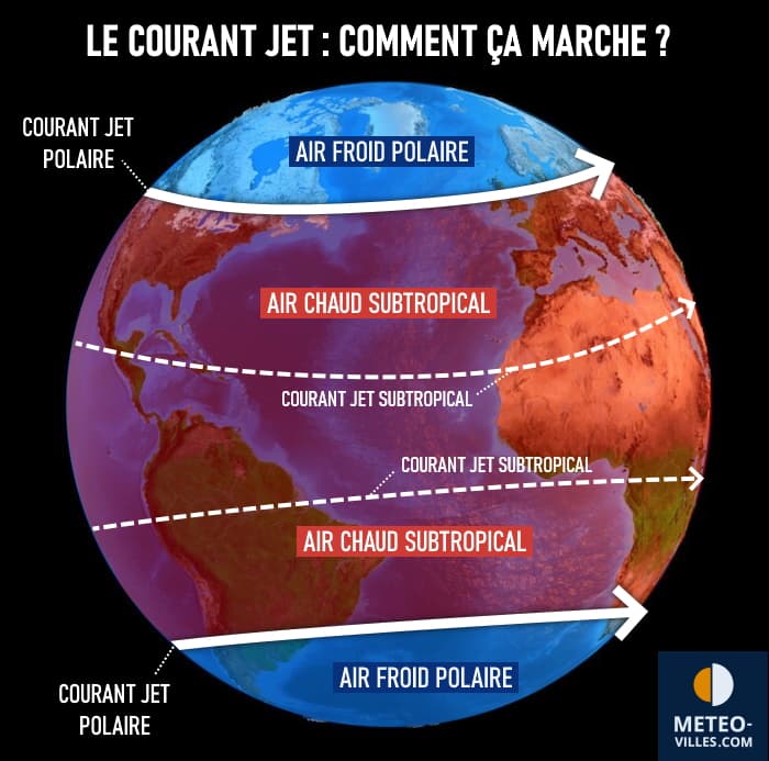 Avant toute chose, il est important de rappeler ce qu'est le courant jet (ou jet stream en anglais). Il s'agit d'un couloir de vents puissants évoluant à haute altitude (vers 9000m) et circulant à la frontière entre l'air froid polaire et l'air chaud subtropical en faisant le tour de l'hémisphère. On note deux couloirs de courant jet polaire, un dans l'hémisphère nord et un dans l'hémisphère sud au niveau des latitudes tempérées. Ce courant jet n'évolue pas toujours sur les mêmes régions car il n'est pas rectiligne et subit des ondulations, à l'origine de la variabilité du temps.
