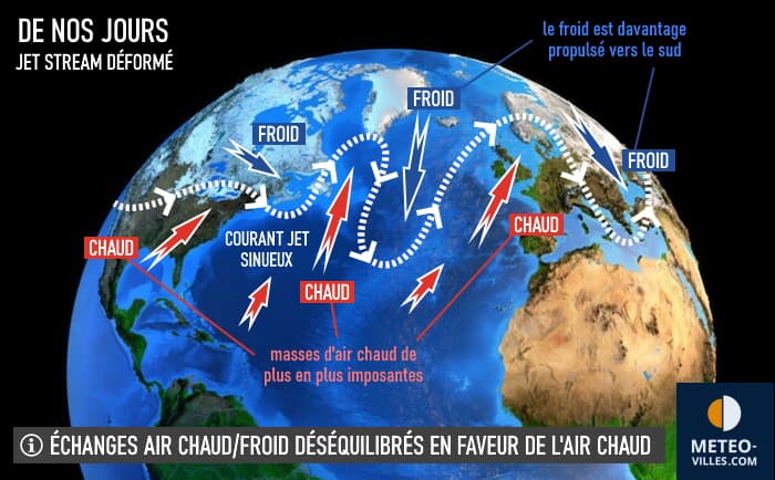 De nos jours, les masses d'air chaud subtropicales sont de plus en plus imposantes, au contraire des masses d'air froid polaire. Comme nous l'avons vu plus haut, le courant jet perd en vitesse lorsque le contraste entre les deux masses d'air diminue. Un courant jet moins puissant tend à devenir plus sinueux, s'élevant parfois jusqu'aux hautes latitudes et plongeant également vers des latitudes très méridionales.