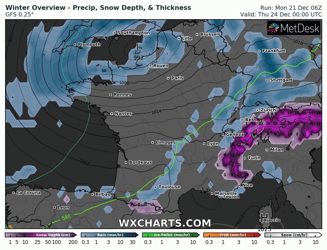 Type de précipitations prévues entre le 24 et le 26 décembre sur la France – modèle GFS via WX CHARTS