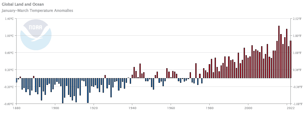 Anomalie de température à travers le Monde pour un 1er trimestre - années 1880 à 2022 - écart à la moyenne du XXe siècle - NOAA