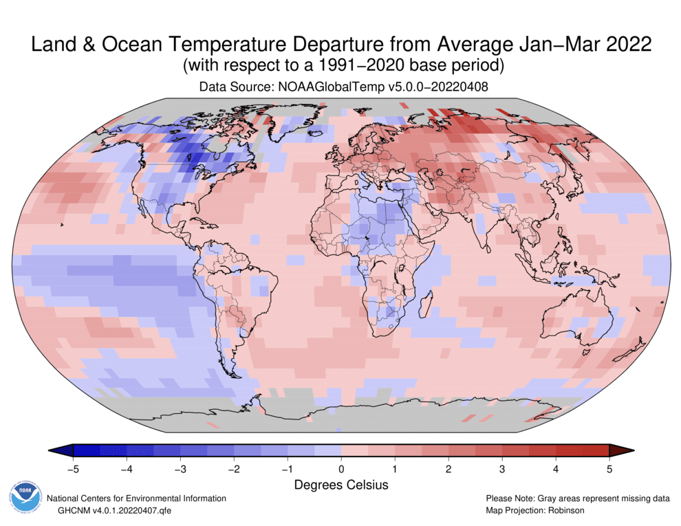 Répartition géographique des anomalies de température à travers le Monde - 1er trimestre 2022 - écart à la moyenne du XXe siècle - NOAA
