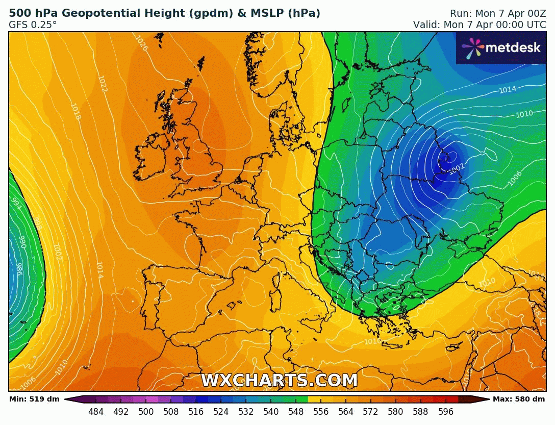Animation des géopotentiels à 500 hPa sur l'Europe du 7 au 12 avril 2025 – Modèle GFS via WX CHARTS