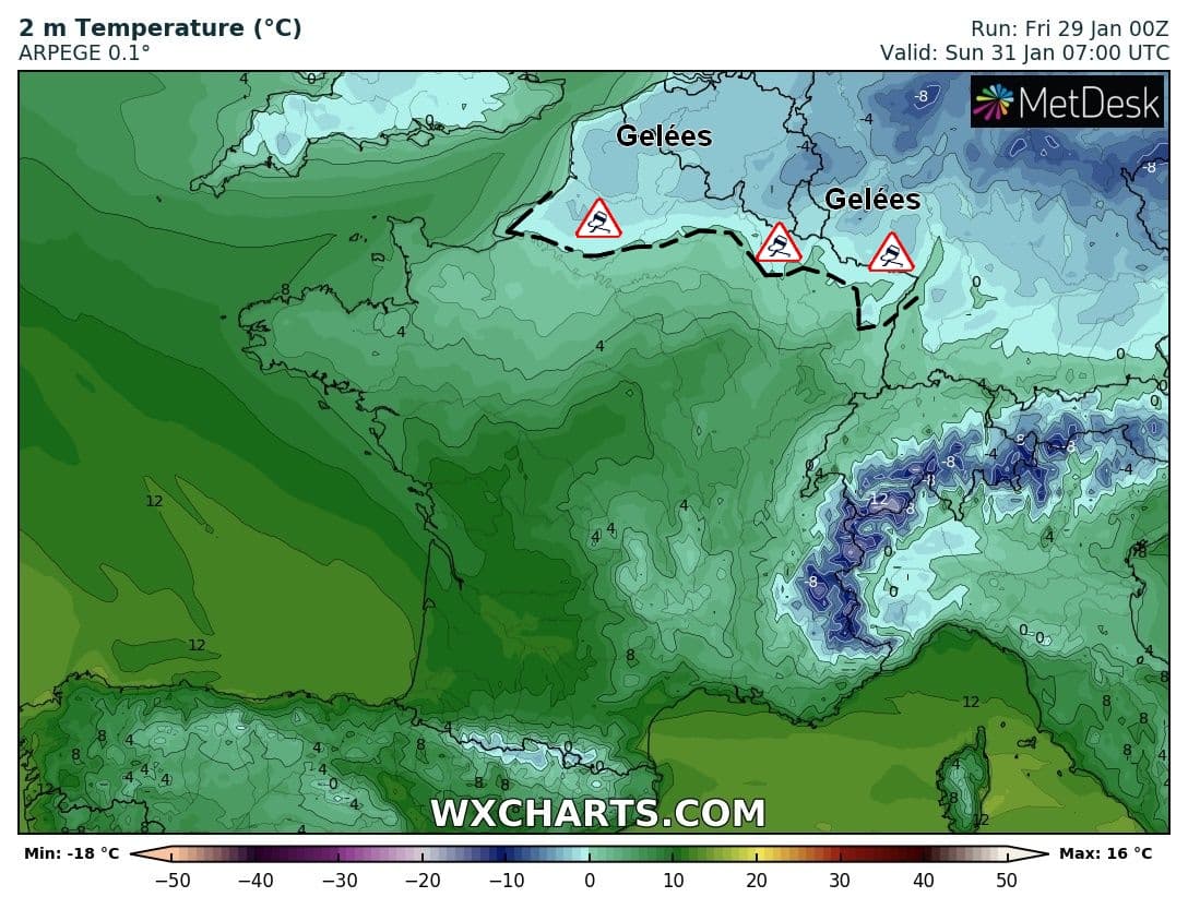 Températures minimales prévues dimanche 31 janvier sur la France – Modèle Arpège via WX CHARTS