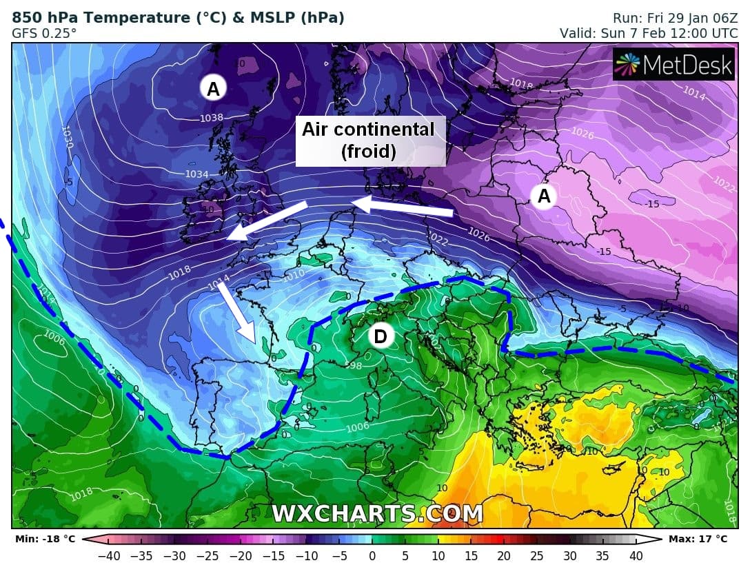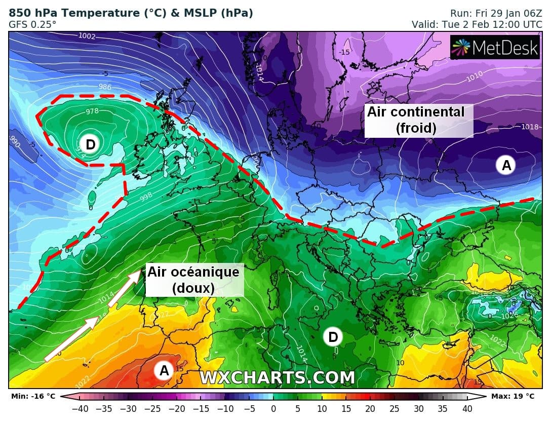 Schéma de la situation atmosphérique du mardi 2 février sur l’Ouest de l’Europe – Modèle GFS via WX CHARTS