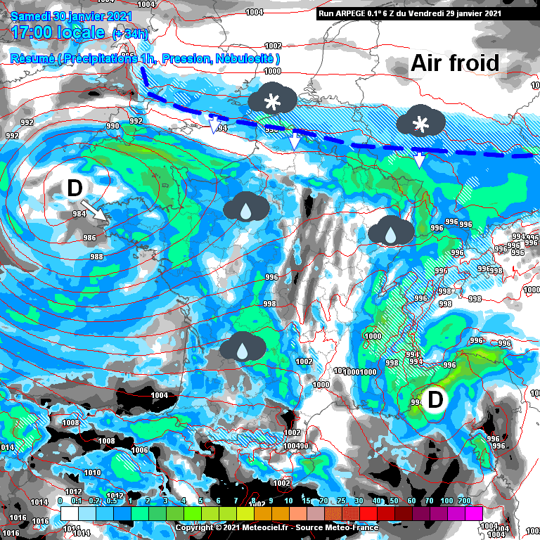 Risque de neige en fin de journée du samedi 30 janvier 2021 – Modèle arome via meteociel.fr (modifié par Meteo-Villes)