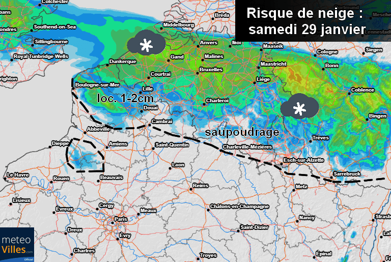 Ainsi, si la pluie devrait dominer une bonne partie de la journée, la neige devrait prendre le relais sur les secteurs allant de la mer du Nord aux frontières Allemandes en fin de journée de demain samedi, déposant parfois une petite couche au sol, notamment sur les Hauts-de-France. Cet épisode s'annonce néanmoins bien plus notable sur l'Allemagne et la Belgique avec plusieurs centimètres probables sur ces zones.