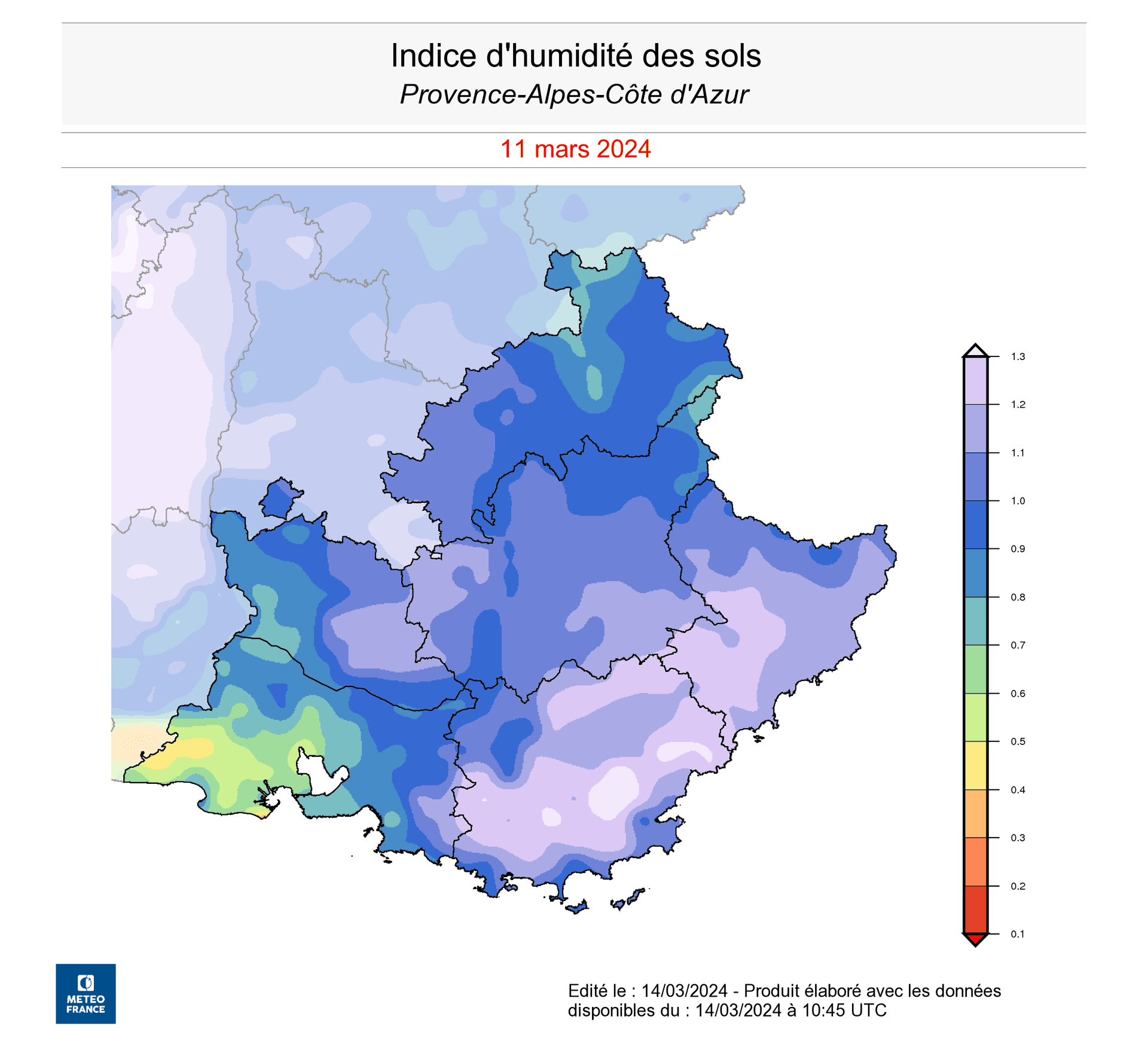 Indice d'humidité des sols sur PACA au 11 mars 2024 - via Météo France