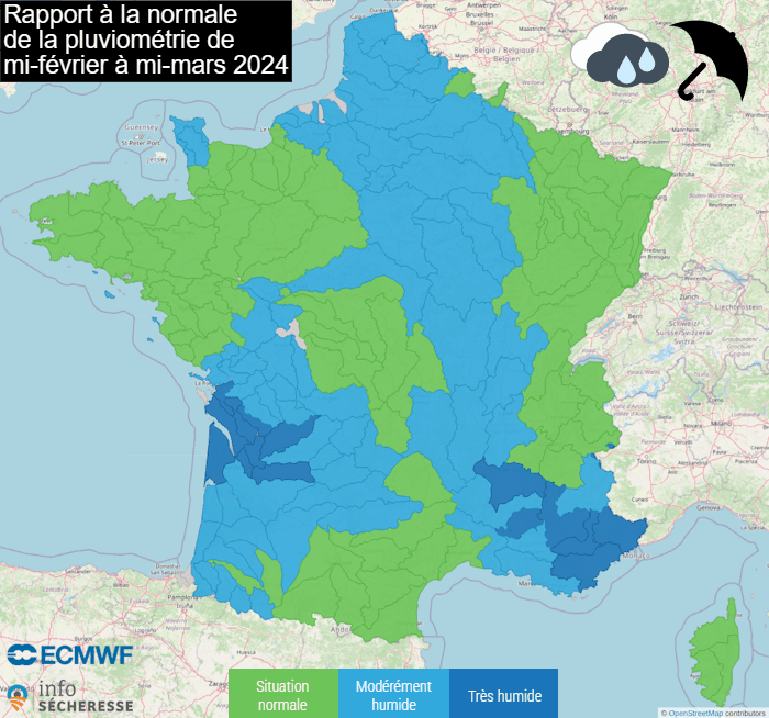 Si l'on se penche sur la pluviométrie depuis un mois, on constate qu'aucune région française n'est en déficit. Entre la mi-février et la mi-mars 2024, plus de la moitié de la France a connu une situation plus humide que la normale (en bleu sur la carte ci-dessous) et même très humide en direction de la Gironde, des Charentes, de la Provence et de la côte d'Azur. La situation est proche de la normale au nord-ouest, du nord des Alpes aux frontières du nord-est, en Occitanie ou encore en Corse.