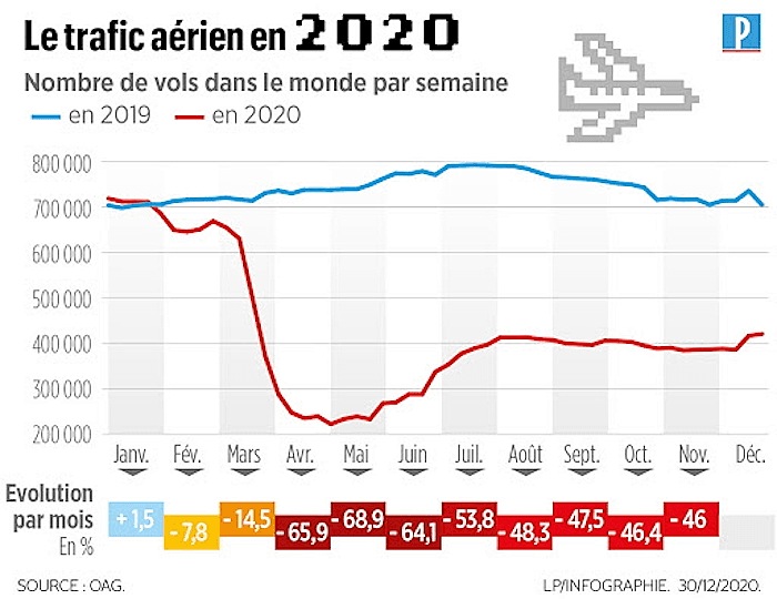 Comparaison du trafic aérien mondial en 2019 et en 2020 - via Le Parisien