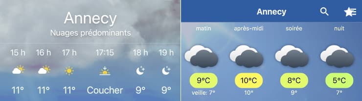 Comparaison entre la météo de l'iPhone (application par défaut avec prévisions automatiques via le modèle américain) et celle de l'application expertisée Météo Annecy (Météo Villes)