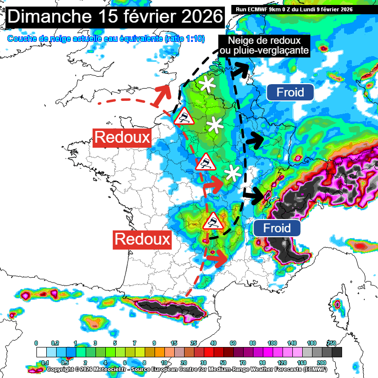 Risque de neige de redoux en France pour le dimanche 15 février 2026 – Modèle ECMWF via meteociel