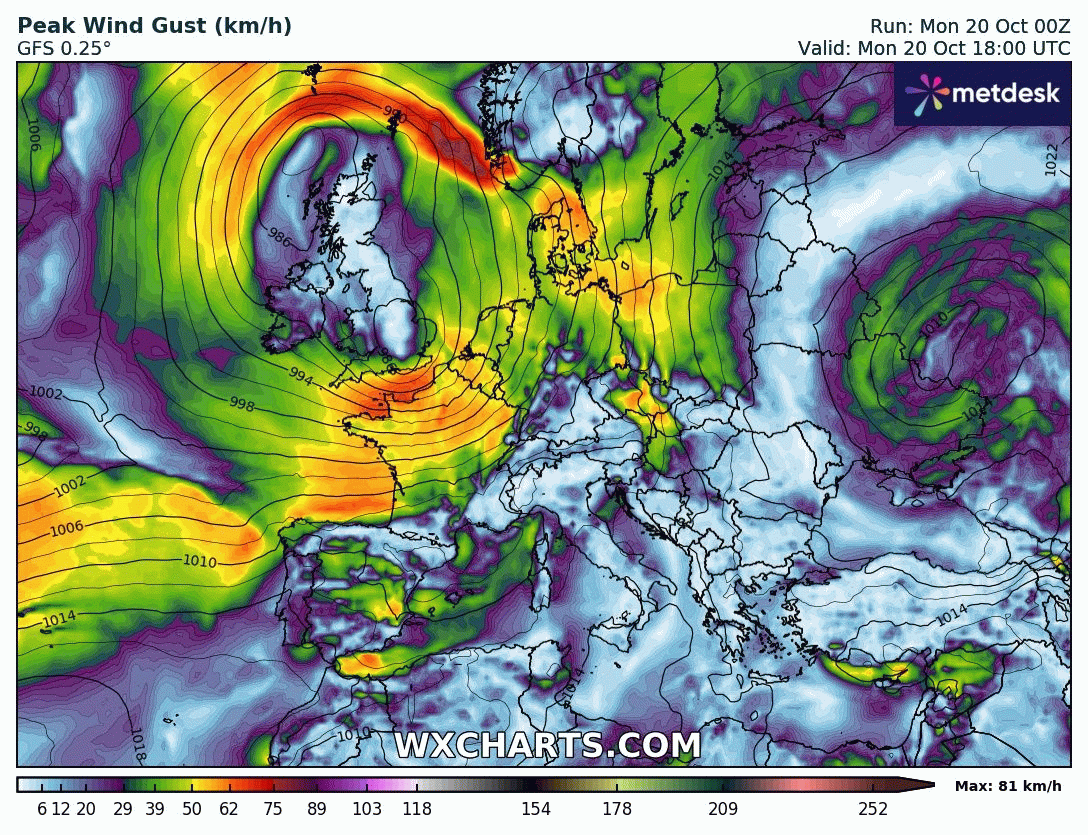 Animation des rafales de vent et des isobares sur l'Europe du 20 au 25 octobre 2025 – Modèle GFS via WX CHARTS