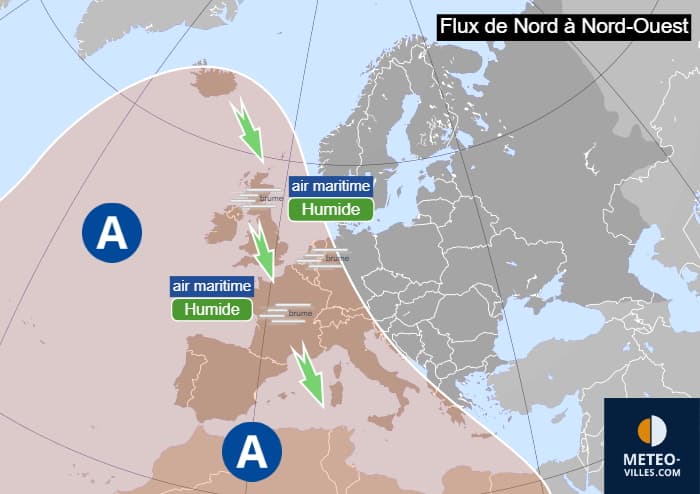 Lorsque l'anticyclone se centre entre le proche-Atlantique et la Méditerranée, le flux s'oriente au secteur nord-ouest ou nord sur la France. Cette orientation des vents est la plus favorable aux nuages bas car elle advecte un air océanique humide en provenance de l'Atlantique, des Îles Britanniques et de la Mer du Nord : rien de tel pour entretenir l'humidité qui reste piégée dans les basses couches. Dans ces configurations, les nuages bas concernent souvent une grande partie de la France, à l'exception des reliefs et des régions méditerranéennes.