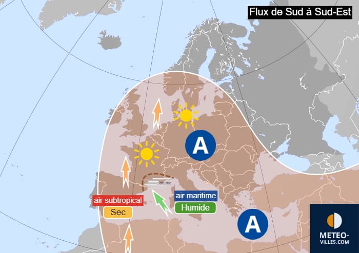 Schéma d'une situation anticyclonique entraînant un flux de sud à sud-est en France - Météo Villes