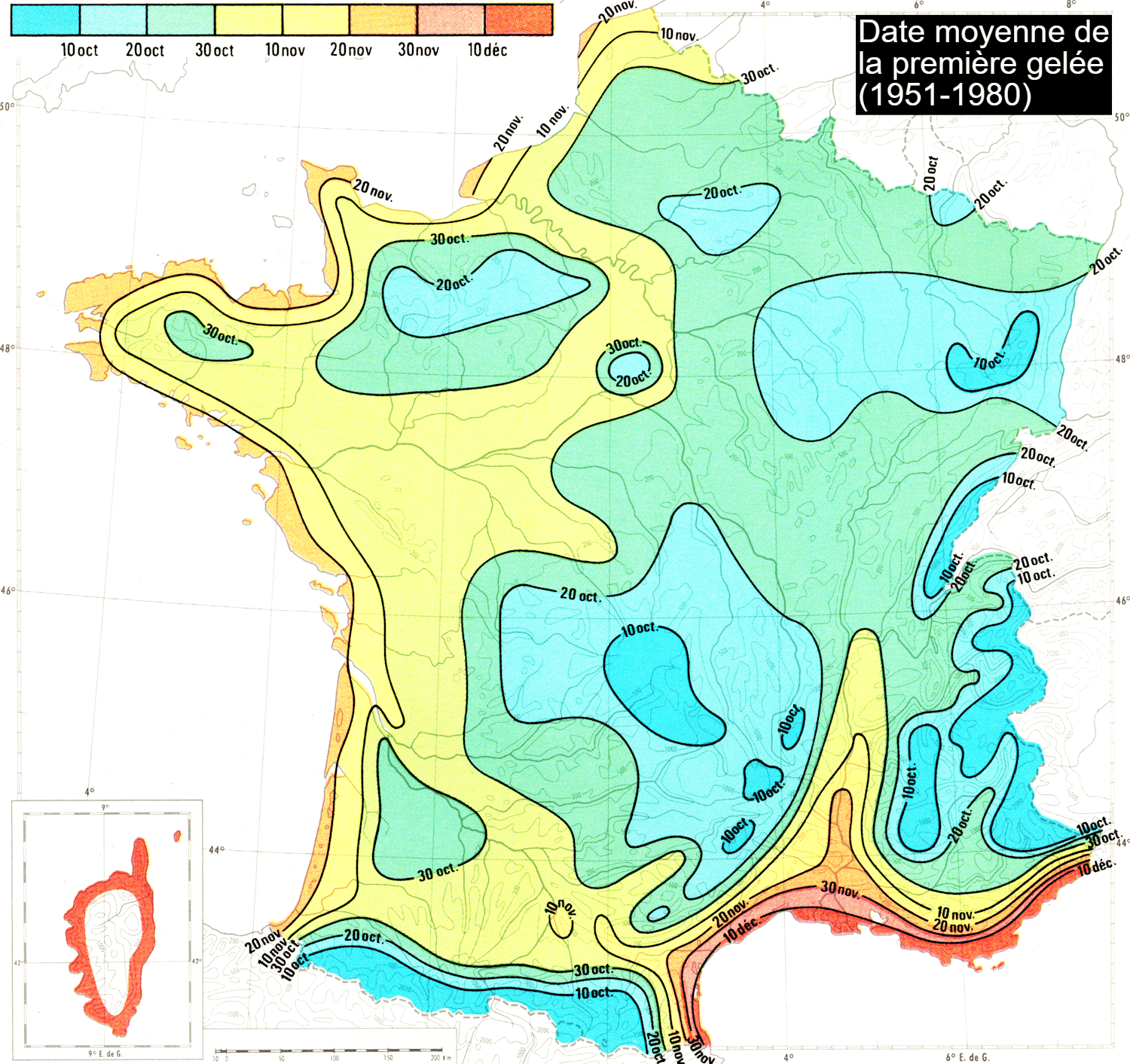 Date moyenne des premières gelées en France sur la base 1951-1980 - Météo Villes