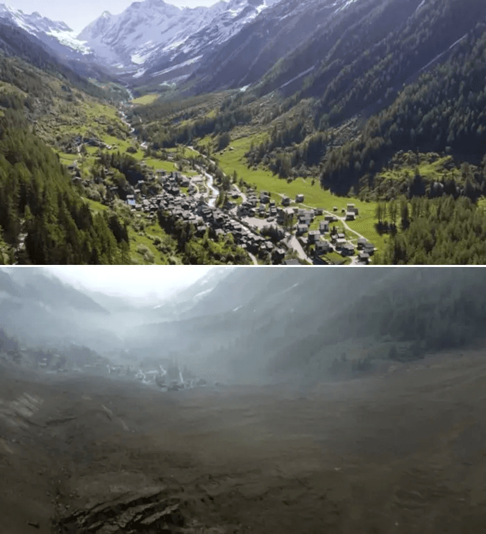 Comparaison avant/après l'éboulement du village de Blatten (Suisse) - photos SRF CH