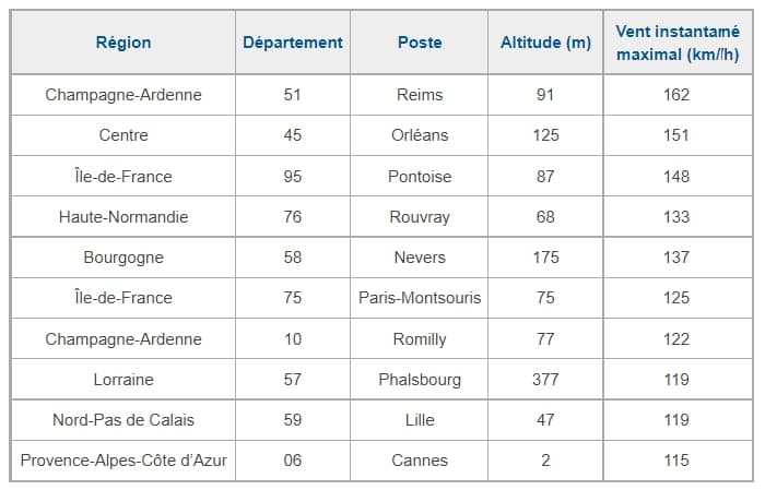 Rafales maximales enregistrées en France le 31 janvier 1953 - tableau Météo France
