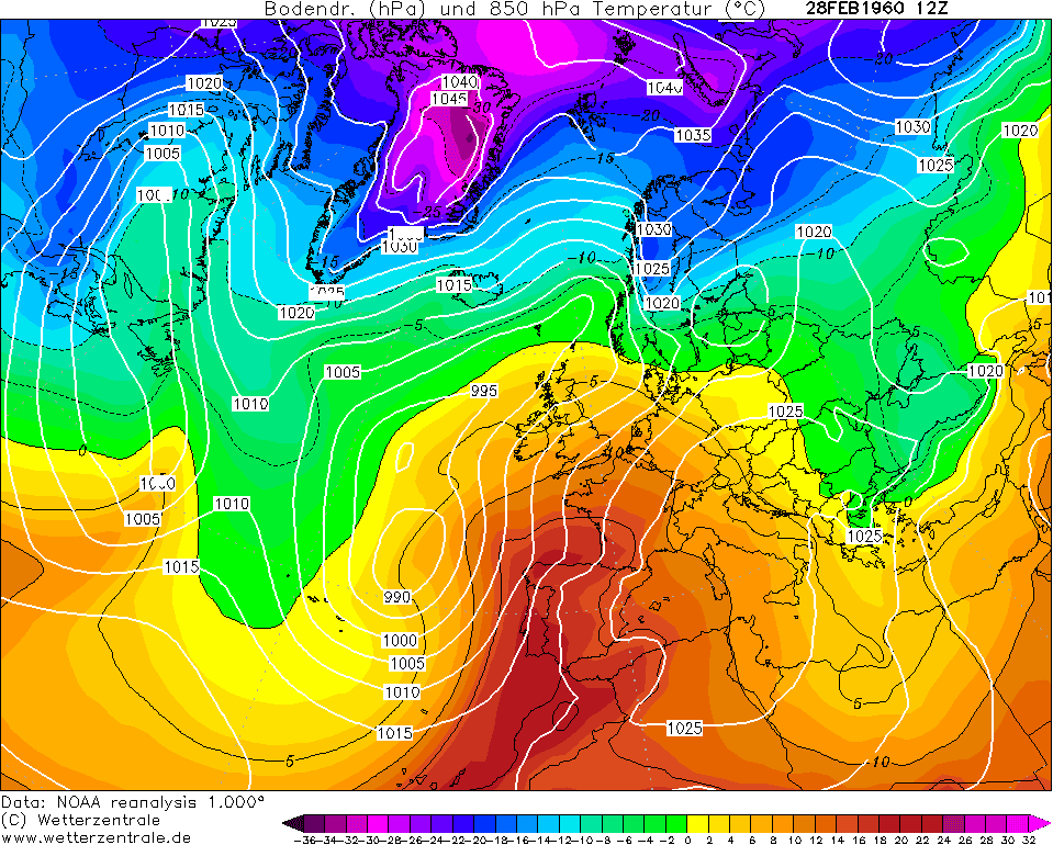 Ré-analyse de la situation atmosphérique du 28 février 1960 – site Wetterzentrale.de