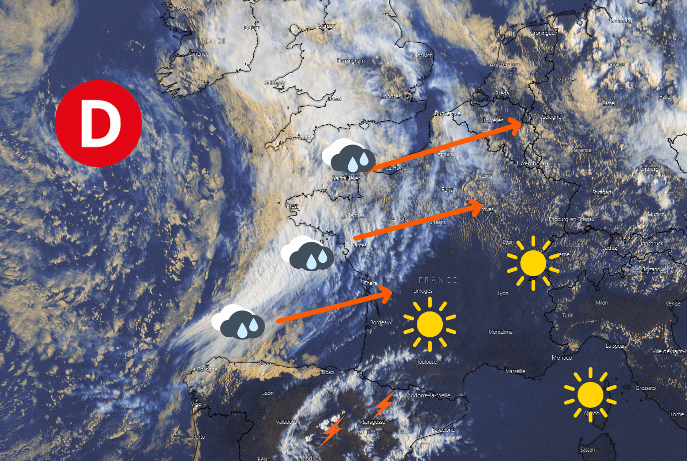 Alors que notre pays s'extirpe à peine de la dégradation de la veille, en profitant d'une journée dominicale en demi teinte (assez nuageuse au Nord de la Loire, mais sèche ainsi que modérément chaude et ensoleillée au Sud), une nouvelle dégradation approche déjà par l'Ouest et concerne la Bretagne, ainsi qu'une partie des Côtes Normandes.