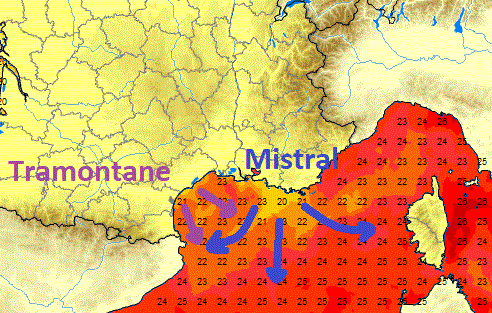 Si la plupart des régions françaises subissent la pluie et la fraîcheur plusieurs fois au cours de l'été, nos habitudes de vacances nous poussent vers les abords de la Grande Bleue. En effet, le climat local y est nettement plus chaud et ensoleillé qu'ailleurs. A quoi s'attendre cette semaine pour vos vacances? Eh bien... Les conditions n'y seront pas non plus optimales! En effet, cet afflux massif d'air froid dans la Vallée du Rhône et le Midi Toulousain vont produire un Mistral et une Tramontane soutenus voire violents. Ainsi, si la pluie ne semble pas au programme dans ces régions, le vent et les températures en baisse ne garantiront pas forcément le ressenti estival attendu à l'exception notable du Var et du pays Niçois où le vent ne sera pas présent (effet barrière des Alpes).