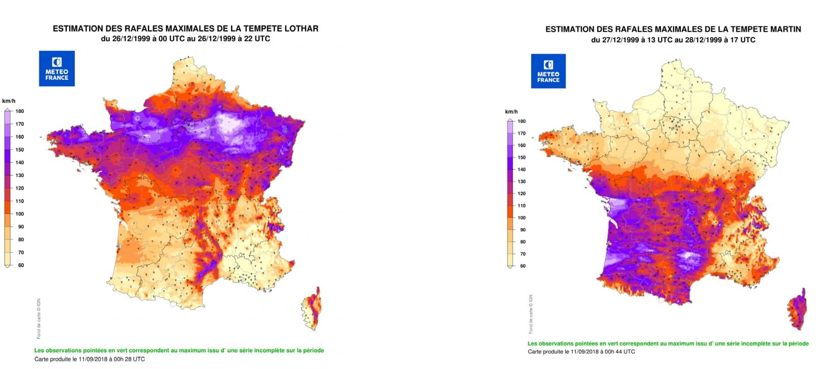 Rafales maximales des tempêtes Lothar et Martin de la fin décembre 1999 - Cartes à retrouver pages 118/119 du livre METEO EXTREME