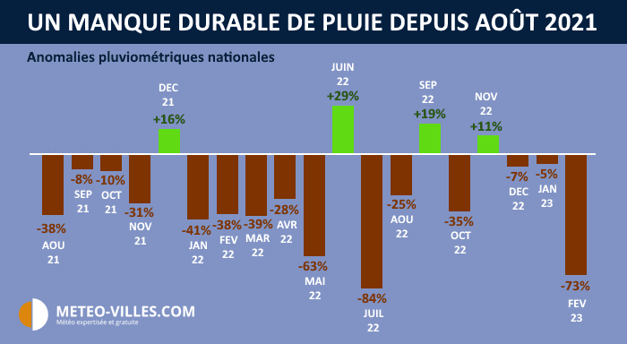 Anomalies pluviométriques mensuelles en France d'août 2021 à février 2023 - Météo Villes