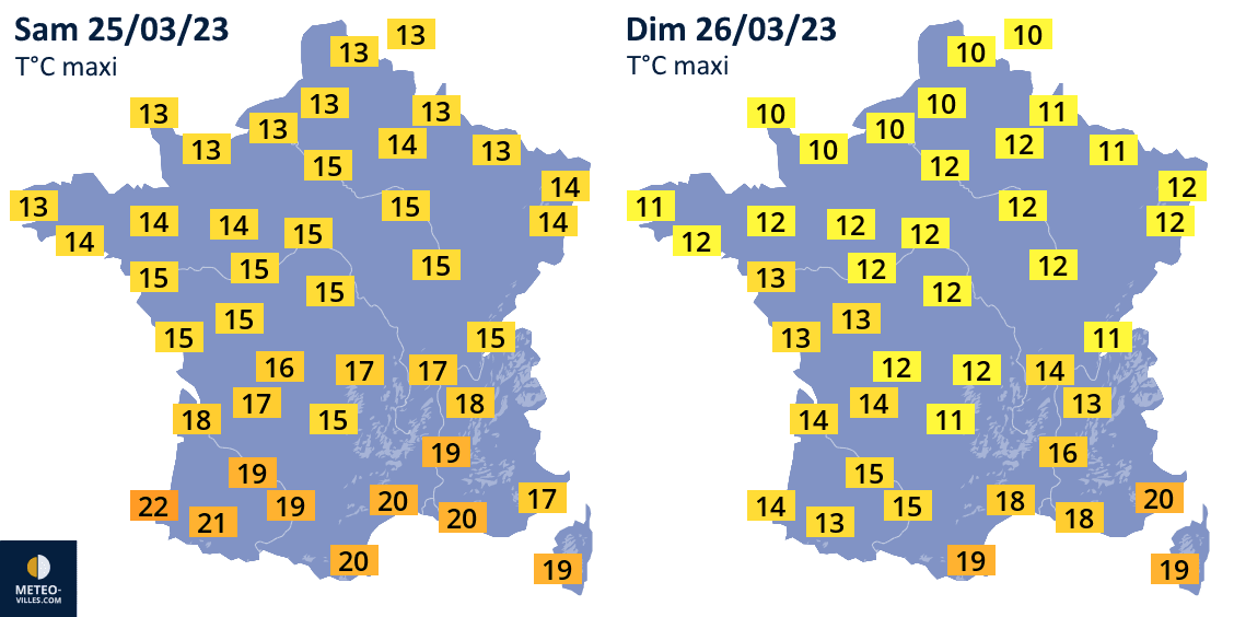 Prévisions des températures maximales pour les samedi 25 et dimanche 26 mars 2023 - Météo Villes